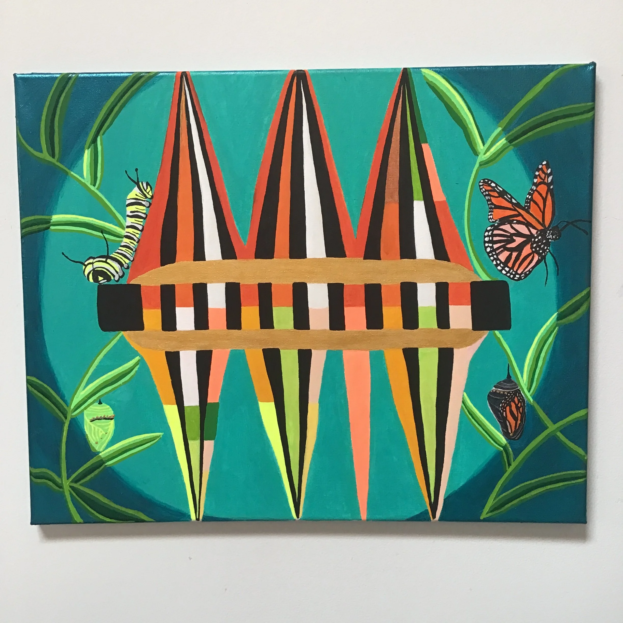 Inspired by working as gardener at Pan’s Garden Nursery, where the artist saw a monarch caterpillar for the first time. The striking yellow, black, and white stripes of the caterpillar inspired her to make a “Harmonica Theory As Art” piece based on the colors of the monarch butterfly’s metamorphosis from caterpillar, to chrysalis, to butterfly. It is the artist’s dream to see a monarch chrysalis in person.
